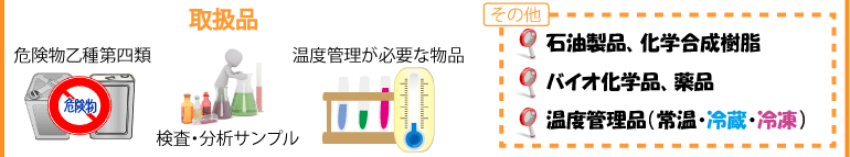 冷蔵・冷凍管理による化学品、医薬品、検体、血液製剤やワクチン、生体由来品等も対応可能です。